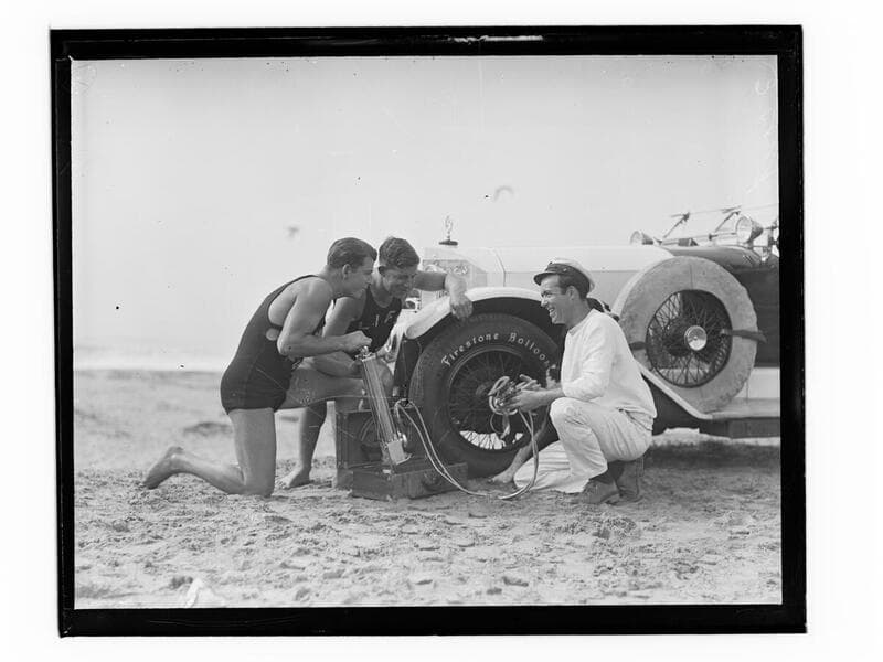 Image of actor, architect, and Santa Monica lifeguard Jack Donovan with two lifeguards and dogs in a Mercedes automobile on the beach in Santa Monica, California. A box for "The Lungmotor" is visible on the running board.
