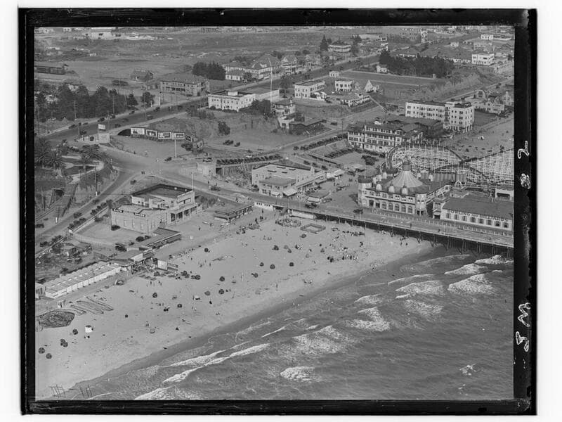 Image of people on the boardwalk and the beach next to the Santa Monica Municipal Pier and Looff Pleasure Pier with the Ocean Park Pier in the distance in Santa Monica, California. A sign for "bowling and billiards" is visible next to the Looff Hippodrome in front of the Blue Streak roller coaster; the Aeroscope ride can be seen behind the left side of the Hippodrome.