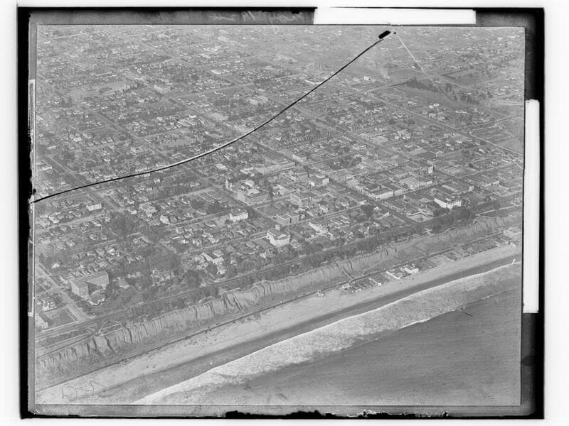 Bird's-eye-view of Palisades, beach and Long Wharf in Santa Monica, California. A train car can be seen in the center, on the railroad tracks parallel to the beach, and a horse and carriage are on the beach, with people near the water. The old "99 steps" bridge is also in center, over the coast road and the train tracks. A path and trees are along the bluff (later Palisades Park), and Ocean Avenue is on the far right, with some houses in view.