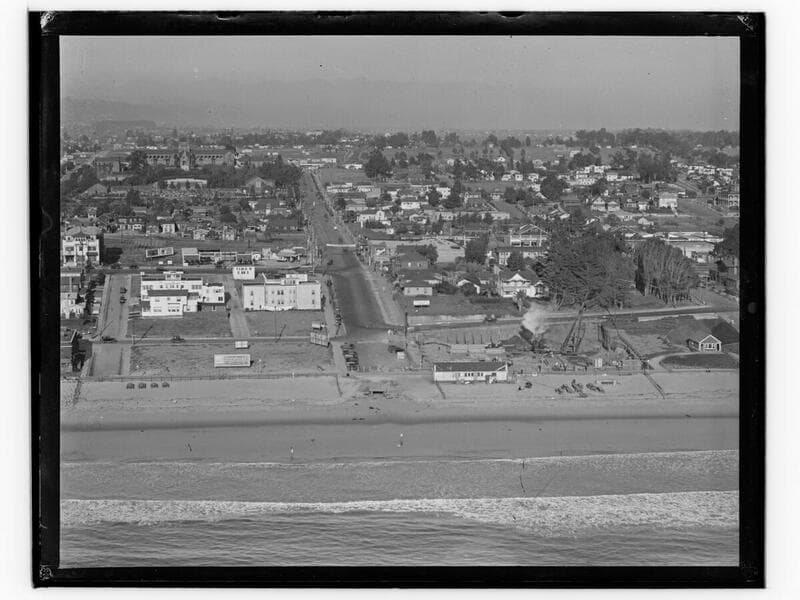 Aerial view of future sites of Edgewater and Casa Del Mar Clubs, Santa Monica, California