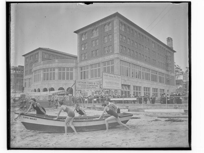 Image of four female swimmers in swimsuits with coach Frank Holborrow pushing a lifeboat on the beach, in front of onlookers and the Club Casa del Mar in Santa Monica, California, with billboard signs for: "Arthur Bard & Co., Builders and Contractors" and "Club Casa del Mar, an exclusive social club ... furnishing Throughout Exclusively By Barker Bros."