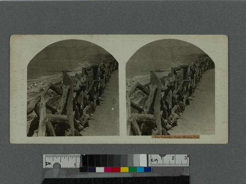 View of the Palisades bluffs above the beach, with a rustic wood fence, and palm trees in Palisades Park in Santa Monica, California. The Sunset Trail path is on the right; a woman is walking down it in the background. The coast road (later part of Pacific Coast Highway) and buildings on the beach are also in the view.