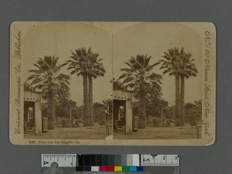 View looking down a dirt road known as Fan Palm Avenue, lined with small palm trees, towards the residence of General Charles A. Longstreet (died 1877) near West Adams Street and Figueroa Street in Los Angeles, California.