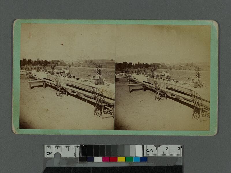 Cabinet card with a bird's eye view of Pasadena, California, looking northeast with orange groves and houses in the foreground and the Raymond Hotel visible in the distance.