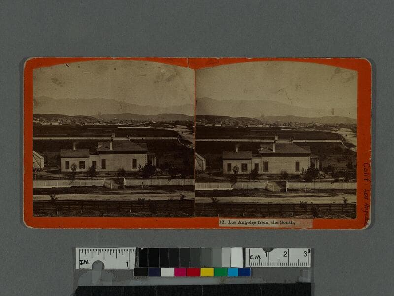 View of the road in front of the ranch of the Haas family in Los Angeles, California, with men, a woman, children, horses, and a wagon standing along the dirt road in the foreground, with trees and house behind a picket fence.