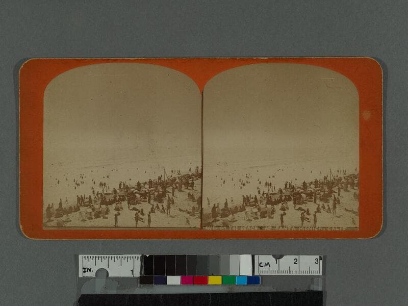 Image of the beach in Santa Monica, California, with beachgoers and buildings visible, including Michael Duffy's bath house visible in the background at the foot of the stairs along the Palisades cliffs.