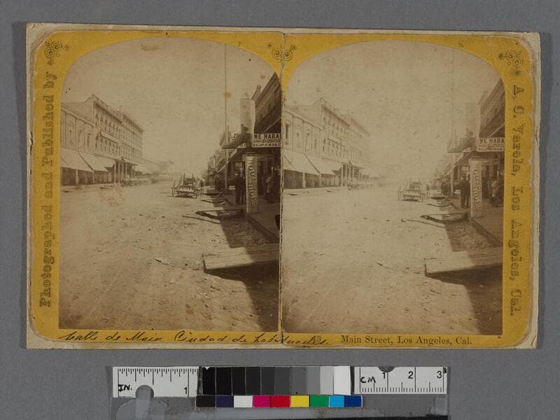 Elevated view of the three-story Italianate Temple Block building with streetcar and horse-drawn carriages in front, at the intersection of Main Street and Spring Street in downtown Los Angeles, California. The clock tower of the old Los Angeles County Courthouse can be seen directly behind the Temple Block building and the four-story Nadeau Hotel building at Spring and First Street can be seen under construction at upper right. With visible signs on the Temple building for "Jacoby Bro's Clothing House" and "County Bank." A sign for "Books" can be seen on the Downey Block building at lower right of image; "California Confectionary and Candy Works" and "Restaurant" can be seen on a building on Main Street in the background at left; and signs for "H. Jevne" and "City Wholesale Dry Goods, Clothing ..." can be seen on building on Spring Street at right.