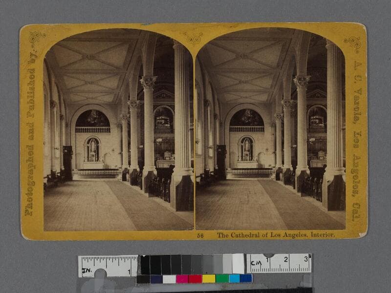 Bird's-eye-view of Los Angeles from Third Street and Hill Street. Some buildings in this view are: the Methodist Church; Congregation B'nai B'rith Synagogue (at center) on the east side of Fort Street (now Broadway), between Second and Third streets; the Cathedral of St. Vibiana (at right in background) located on Main Street, just south of Second Street.