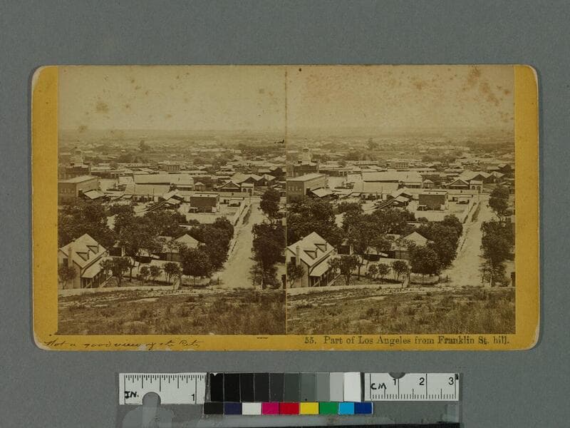 Elevated view looking southwest from Poundcake Hill towards Fort Street (now South Broadway) in downtown Los Angeles, California. A two-story brick building (visible at center left) sits on the southwest corner of Fort Street, at the intersection with First Street. Hill Street is parallel to Fort Street partway up the hillside, passing in front of the houses at upper middle left.