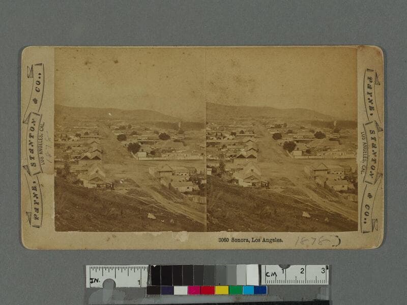 Elevated view of the Plaza district of Los Angeles (also known as Sonora Town) as seen from Fort Hill (also known as Fort Moore Hill), looking north with Buena Vista Street (now North Broadway) at right, and Bellevue Avenue (later Sunset Boulevard and now Cesar E. Chavez Avenue), the first intersecting road below.