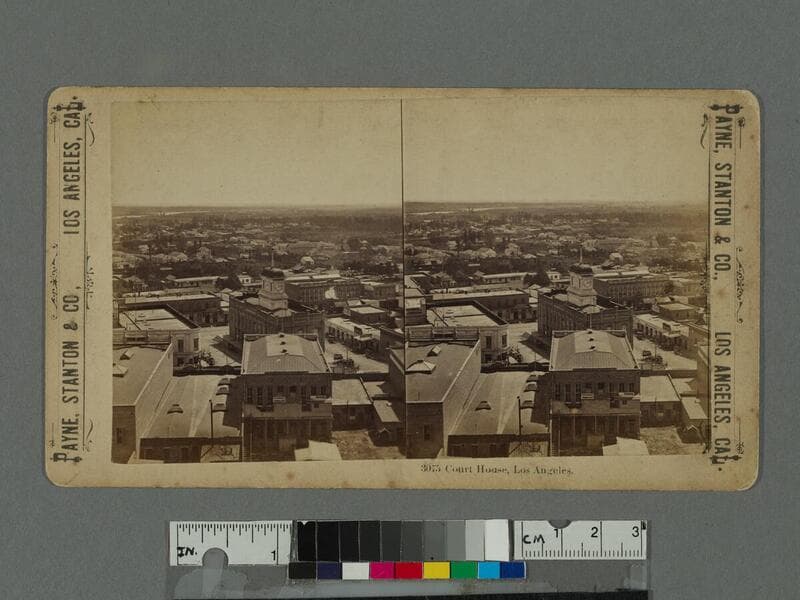 Elevated view looking southeast over houses, back yards, and stores in downtown Los Angeles, California, with the Los Angeles and Independence Railroad depot (with two towers at San Pedro Street and Fourth Street) visible at far right in the distance and the tower of the Woodworth House at Second Street and San Pedro visible at middle left. Visible signs include "[?" R. Cameron," "Marble Works" (presumably in the 100 block of Main Street), and "Furniture."