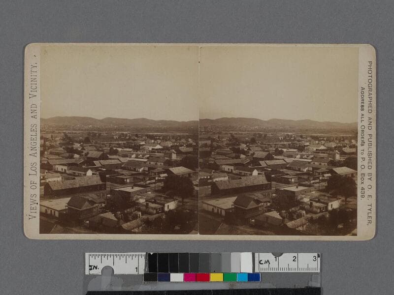 Elevated view of the Plaza district of Los Angeles (also known as Sonora Town) as seen from Fort Hill (also known as Fort Moore Hill), looking north with Buena Vista Street (now North Broadway) at right, and Bellevue Avenue (later Sunset Boulevard and now Cesar E. Chavez Avenue), the first intersecting road below.