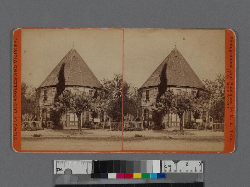 Elevated view looking east down onto Third Street in downtown Los Angeles, California, with dwellings, yards, and trees visible in the foreground. In the background the Round House (with conical roof at 311 South Main Street) and the Los Angeles and Independence Railroad depot (with two towers at San Pedro Street and Fourth Street).