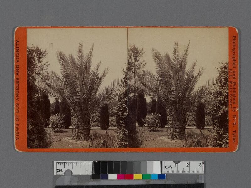 View looking down a dirt road known as Fan Palm Avenue, lined with small palm trees, towards the residence of General Charles A. Longstreet (died 1877) near West Adams Street and Figueroa Street in Los Angeles, California.
