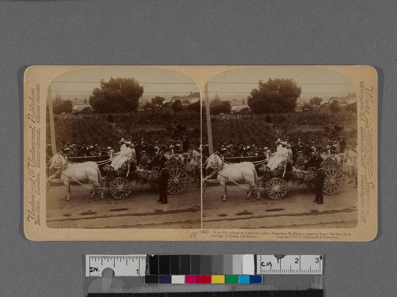 Beautiful tribute to a beloved ruler - President McKinley entering Santa Barbara in a Carriage of Roses, California