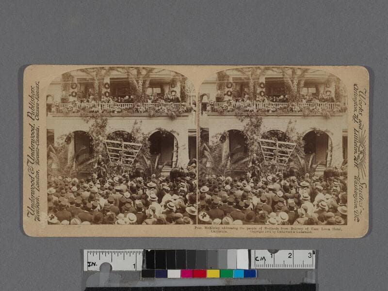 President McKinley addressing the people of Redlands from balcony of Casa Loma Hotel, California. Copyright 1901