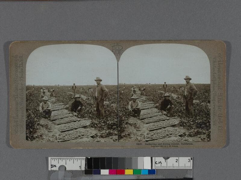 Image of a label for McPherson Brand raisins; an elevated view of the town of McPherson, California, created by the McPherson Brothers packing company in the 1880s (now Orange, California) surrounded by fields full of grape vines with mountains in background; decorative border of grapes and vines.