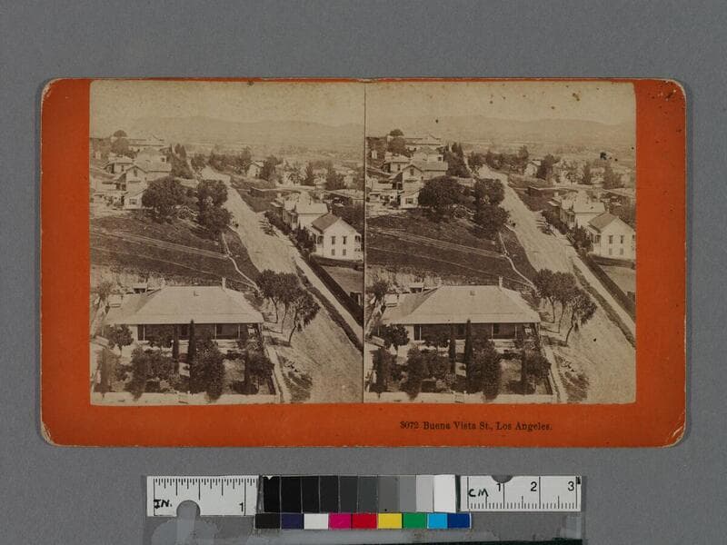 Elevated view of the Plaza district of Los Angeles (also known as Sonora Town) as seen from Fort Hill (also known as Fort Moore Hill), looking north with Buena Vista Street (now North Broadway) at right, and Bellevue Avenue (later Sunset Boulevard and now Cesar E. Chavez Avenue), the first intersecting road below.