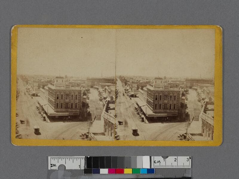 Elevated view of downtown Los Angeles, California, focused around the three-story Italianate Temple Block building on Spring Street, at the intersection of Main Street and Spring Street; in the background a two-story building with the sign "El Dorado Store" visible (listed at 76 Main Street in an 1873 advertisement in the Los Angeles Herald).