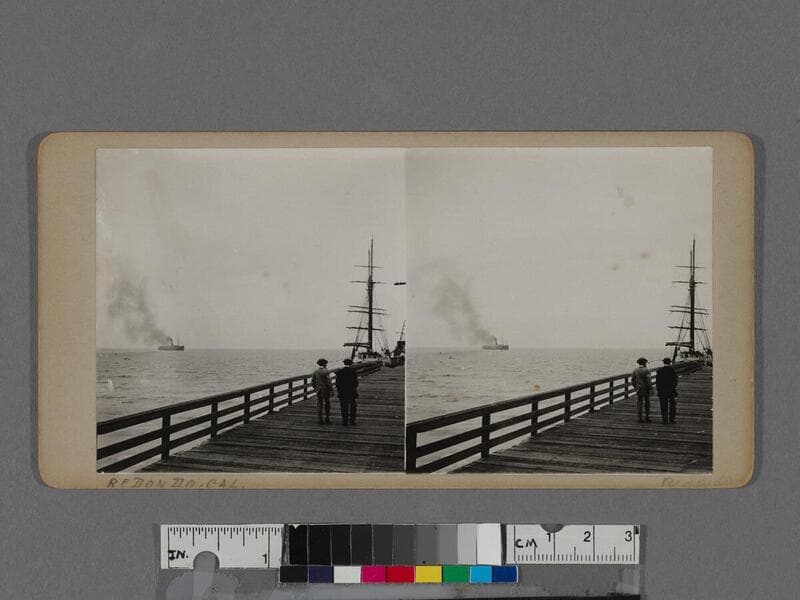 Image of the Redondo Beach Wharf with flatcars on railroad tracks and lumber on the dock in Redondo Beach, California, with schooners docked next to shipping cranes and more ships at sea in the distance. The flatcars have "Frisco 150 59" printed on the edge.