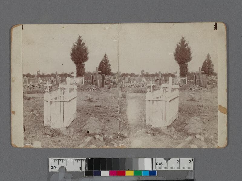 An unidentified man leaning against a fence among crosses and gravestones in the cemetery behind the Mission San Gabriel Arcangel in San Gabriel, California.