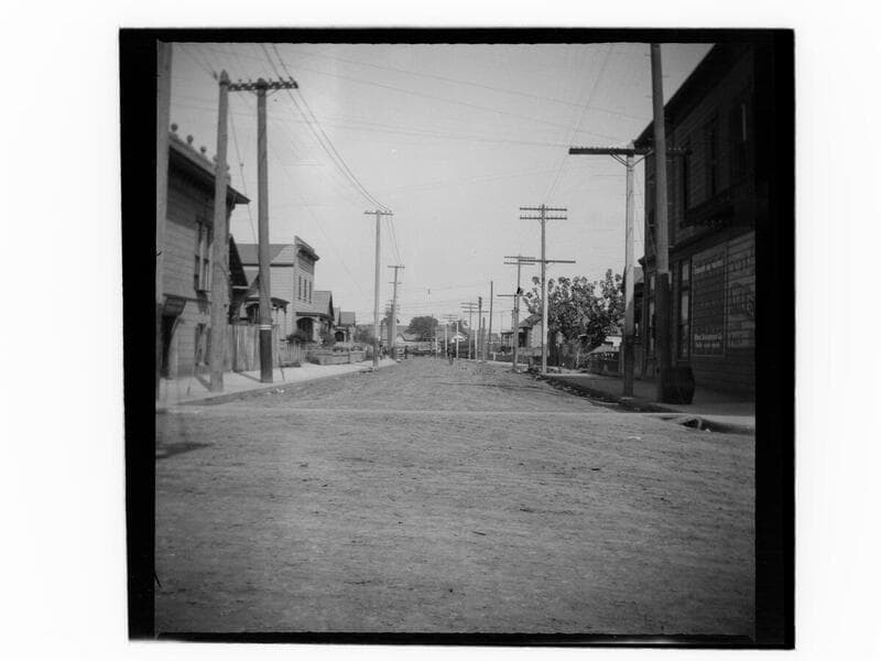Image of an intersection at Alvarado Street and Ocean View Avenue (street names visible on corner sign) in the Westlake Park neighborhood of Los Angeles, California, with a Mission Revival house on the corner and oil wells in the background. Street railroad tracks can be seen in the dirt road. There are sprinklers and a man with a hose watering the lawn on the corner.