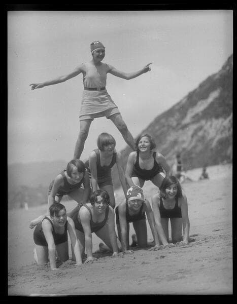 Scouts make a human pyramid on the beach at Santa Monica Girl Scout camp