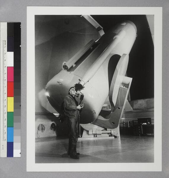 Edwin Powell Hubble at [inside] the 200 inch Hale telescope. Photograph by Life Magazine. Note in the hand of Grace (Burke) Hubble: "Photograph used in "The Universe" published by Life Magazine 1963?"