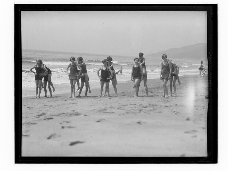 Image of Girl Scouts in bathing suits playing leap frog on the beach at Santa Monica Girl Scout camp, Santa Monica, California.