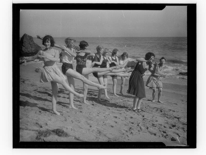 Scouts playing leap frog on the beach at Santa Monica Girl Scout camp