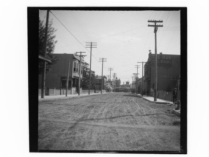 View looking down North San Pedro Street (previously Wilmington Street until ca. 1902) from near the intersection of First Street in Los Angeles, California. On the right are signs for "Neil Finkelstein, Junk Dealer" (listed at 114 N. San Pedro Street in the 1905 Los Angeles City Directory), Larson's House (May C. Larson was listed under furnished rooms at 124 N. San Pedro in the 1902 directory), and "Fruits and Groceries." A building on the left has a sign that says "Wilmington House" (a boarding house at 125 North San Pedro in the 1902 directory).