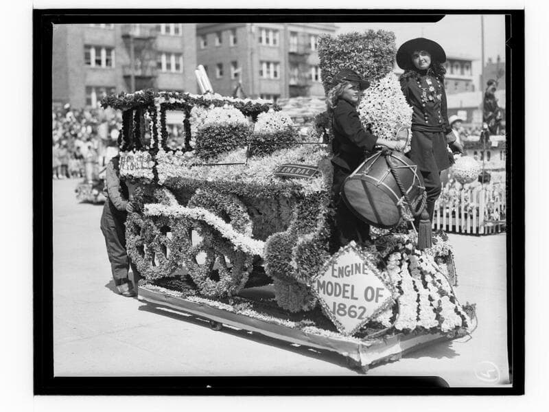 Image of two girls dressed in uniforms, with one holding a drum, with a train float decorated with flowers at the Ocean Park Baby Parade in Ocean Park, Santa Monica, California. A sign with "Engine model of 1862" is seen on the side of the float. In the background a float has the sign "Mickey Mouse Band."