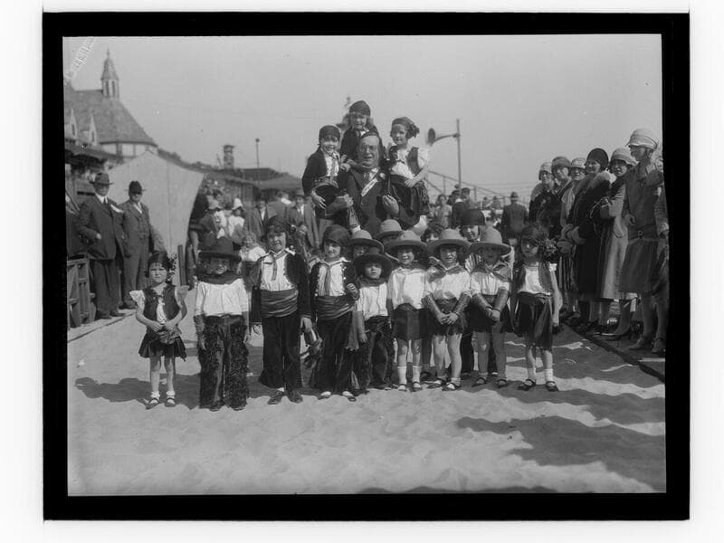 Troupe picture of Meglin Kiddies with a man in front of Gables Beach Club, Santa Monica