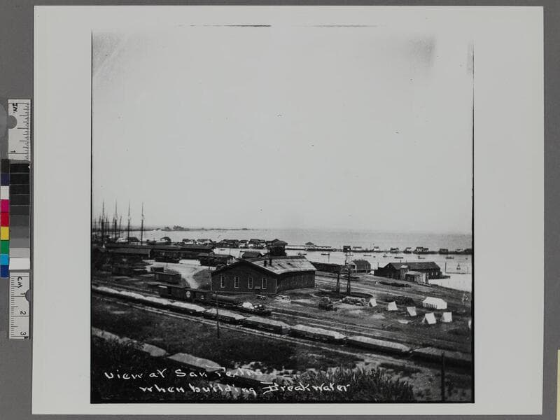 San Pedro – View of harbor, railroad tracks and tents "when building breakwater." [print only]