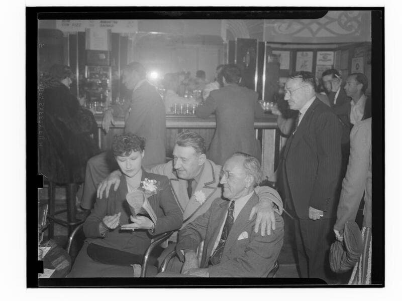 View of the interior of the Melrose Tavern bar in Hollywood, California. Customers are at the bar with drinks, and there is a large menu listing cocktails and prices. There is a poster for World War II war bonds on wall, at right.