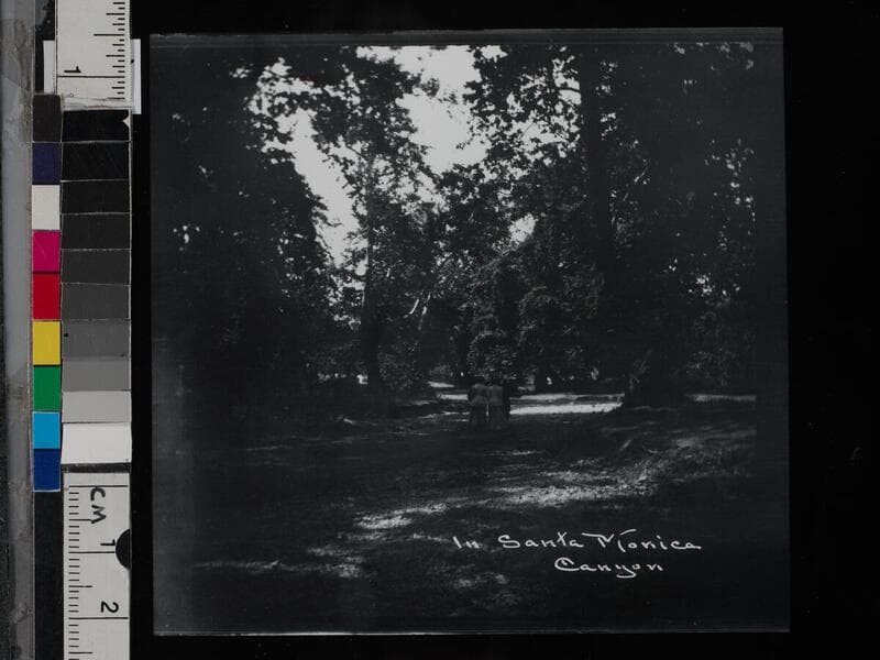 Stereographic photograph of a path framed by large sycamore trees in Santa Monica Canyon, California.