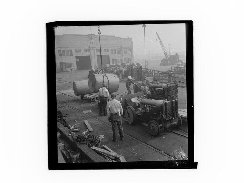 Rolls of newsprint unloaded at the dock, Port of Los Angeles