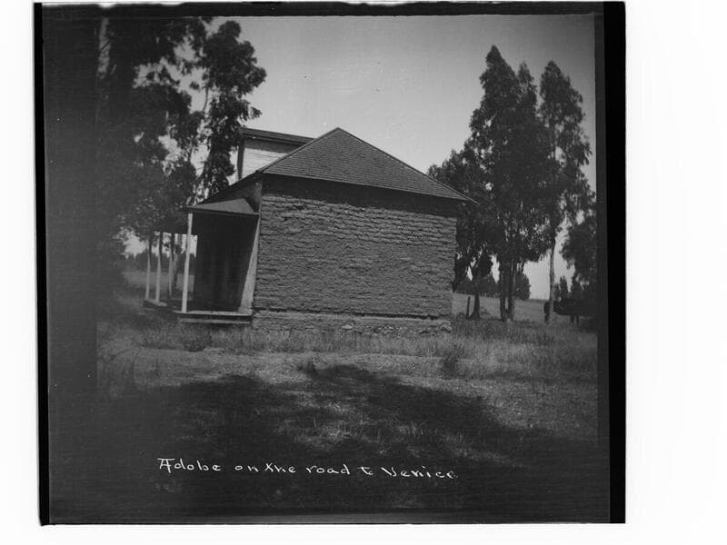 View of an adobe building identified as the "Ruiz" home on Mission Road in Los Angeles, California.