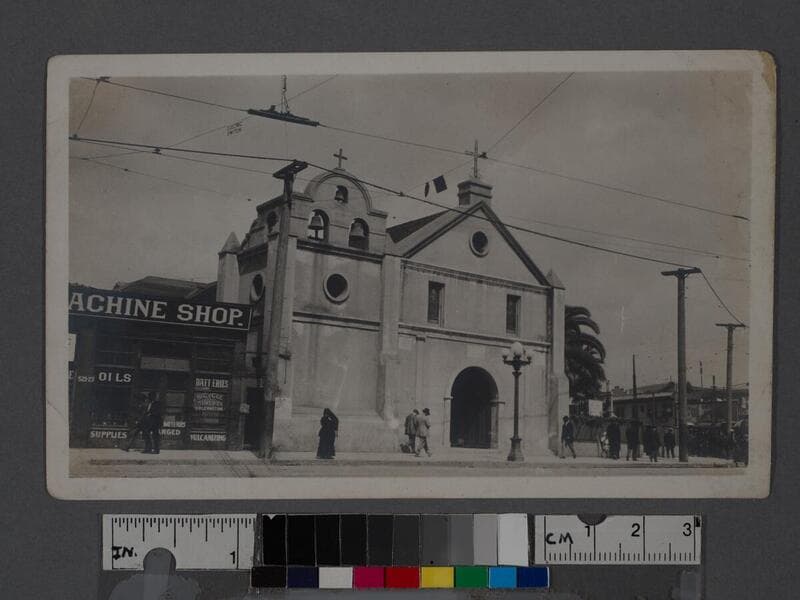 Image of the Plaza Church, also known as Our Lady Queen of the Angels or La Iglesia Nuestra Señora de los Angeles, on North Main Street in Los Angeles, California. Street lights, overhead trolley cables, automobiles and storefronts can be seen on either side of the church with signs reading "Coloso ice cream cones" "Olvera Shine Stand 525" and "La Azteca Joyeria y Relojeria 535."