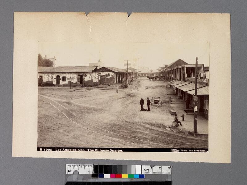 Elevated view of the dirt road, horse-drawn wagons, and storefronts along the Calle de los Negros (also known as "Nigger Alley") in Old Chinatown in Los Angeles, California, with a sign for "J. Kennedy" in the shape of a horseshoe at right.