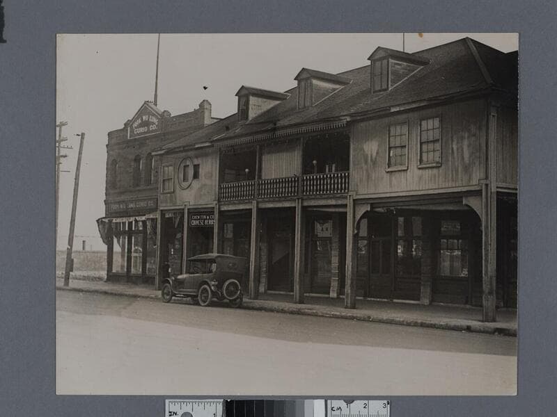 View of a Chinese man crossing the street in front of a row of two story-brick attached buildings with balconies in the 300 block of Apablasa Street in Old Chinatown, Los Angeles, with a sign for the "Mon Chong & Co." store at 341 Apablasa Street. Some of the balconies have awnings and decorative fretwork, as well as potted plants. The headquarters of the Bing Kong Tong Society was located at 337 1/2 Apablasa Street.