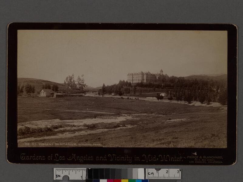 View of Los Angeles, California, showing trees, houses, hills and a road leading to St. Vincent Sanitarium (also called St. Vincent Hospital or Sisters Hospital) at far right, which was located in Beaudry Park.
