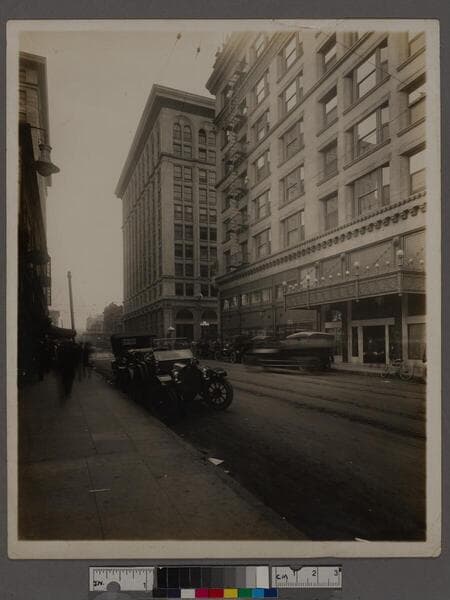 View of the ruins of an adobe building on a street corner in Los Angeles. Posters on the fence to the left have the address "320 So. Spring St." (which is in Los Angeles). There are other buildings, electrical poles and sidewalks in the view also.