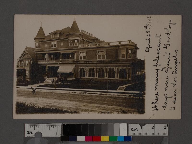 Image of an African American boy standing in front of a group of people on the front porch of the Santa Monica Hotel on Ocean Avenue in Santa Monica, California. A sign for the hotel that reads "Santa Monica Hotel" can be seen on the south side of the front building facing Railroad Avenue (present day Colorado Boulevard.).