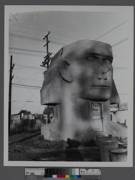 The Sphinx Realty Company building, at 537 North Fairfax Avenue in Los Angeles, California, built in the shape of the head of a sphinx. The business was no longer operating from this site when the photograph was made, as it shows a "For Rent" sign on the door.