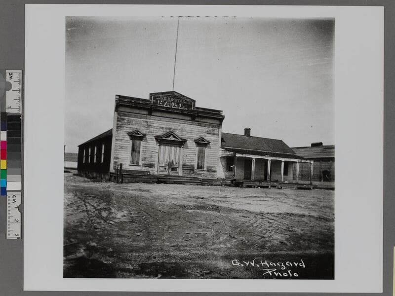 View of a building in Wilmington, California, with a sign that says "Wilmington Journal. Commercial printing." A smaller building next door has a sign that says "Office. Columbian Investment Co. Real Estate."