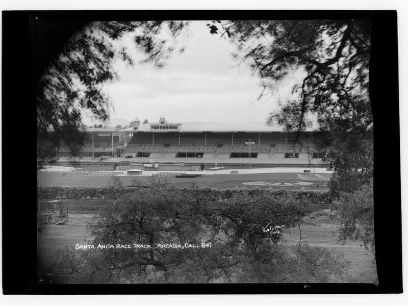 Image of the horse paddock and surrounding benches and trees in front of the grandstand building Santa Anita Race Track in Arcadia, California.