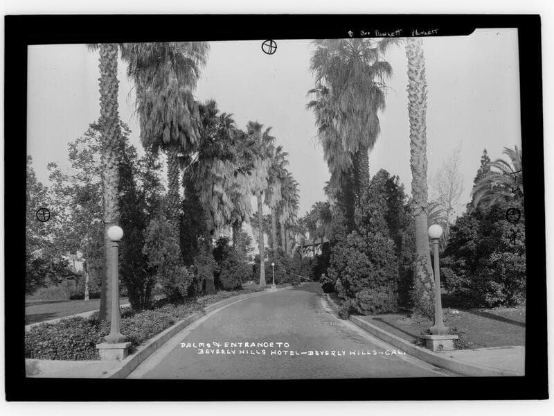 Palms & entrance to Beverly Hills Hotel, Beverly Hills, Cal