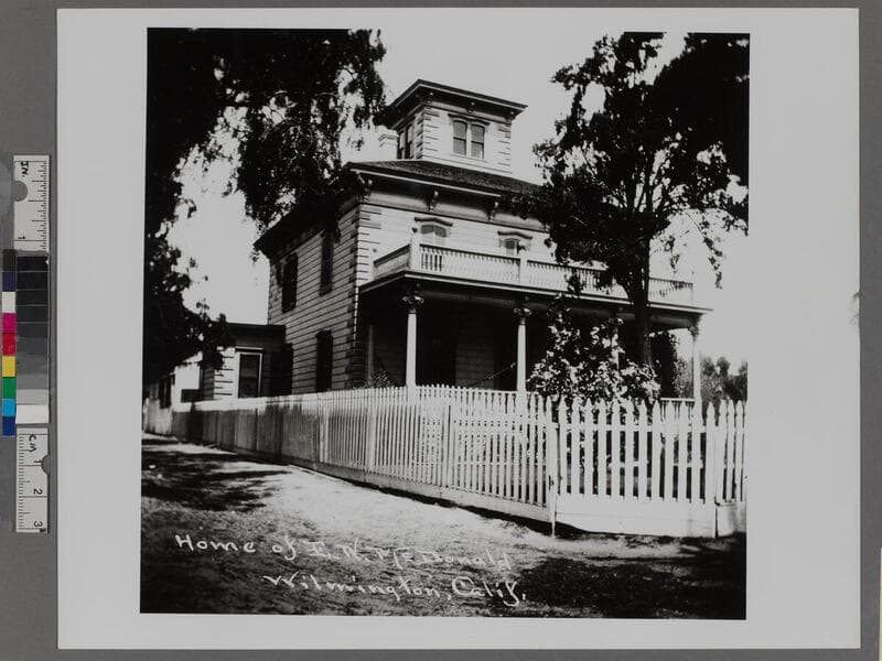 Image of the residence of Edward Nathaniel McDonald (1832-1899), a Los Angeles pioneer and businessman, located in Wilmington, California, showing a vine-covered porch, balcony, cupola, and a windmill at right.