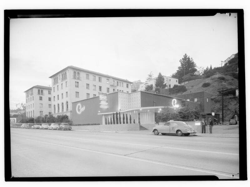 Street view of Ciro's restaurant and nightclub at 8433 Sunset Boulevard in Hollywood, California, with a banner on the building for "H.D. Hover Presents Xavier Cugat," and a taxi cab parked on the street with an advertisement for "Chevron Supreme Gasoline."